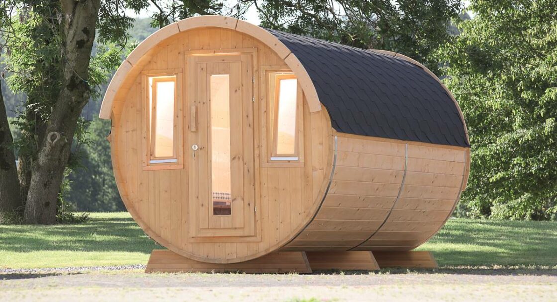 Campen im eigenen Garten. Unvorstellbar? Mit dem Campingfass ist´s möglich. Zwei Räume, ein großes Bett, ein ausklappbarer Tisch und Bänke. Ihre Gäste werden das Campingfass Chris mit schwarzen Dachschindeln lieben.