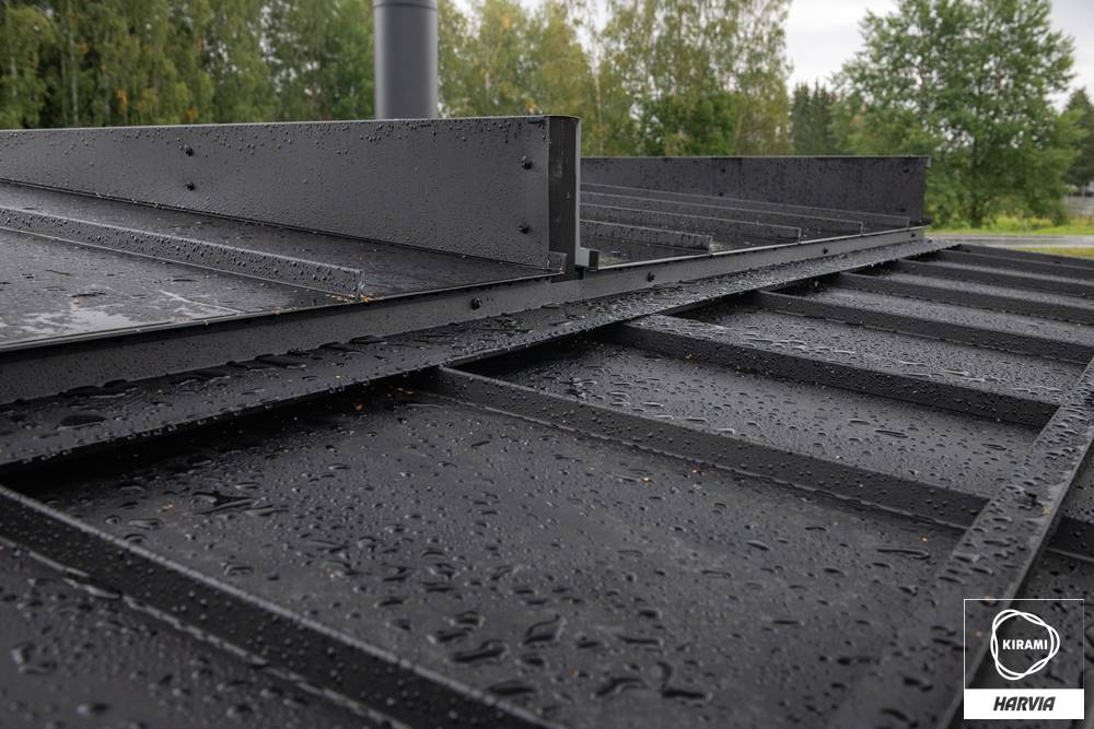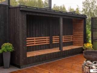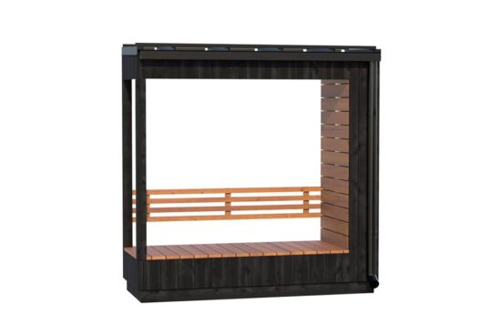 Das Kirami FinVision® -Bankmodul ist für den Außenbereich gedacht und kann hinter eine Kirami FinVision® -Sauna, eine Lounge oder eine Terrasse der Größe M montiert werden. Das Bankmodul besteht aus einem Dach, einer Umfassungswand auf der linken Seite des Moduls und einer Bankebene. Auf der anderen Seite befinden sich an den Ecken Pfosten. Das Bankmodul wird mit dem anderen Modul am Dach, an der Seitenwand und am Pfosten befestigt. Die zum Verbinden der Dächer verwendeten Blechleisten werden mit dem Bauwerk mitgeliefert.