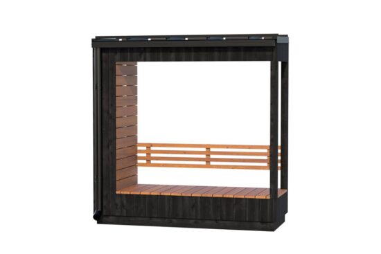 Das oberflächenbehandelte Kirami FinVision® Bankmodul Misty hat eine Außenfläche aus wärmebehandelter Fichte und Innenflächen aus wärmebehandelter Kiefer. Das Modul verfügt über ein vormontiertes Falzblechdach. Ein Schneefanggitter ist ebenfalls im Lieferumfang enthalten. Ein Regenwasserablaufsystem für die vordere Kante des Moduldaches ist im Lieferumfang enthalten und wird entsprechend der Anleitung montiert.