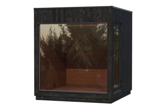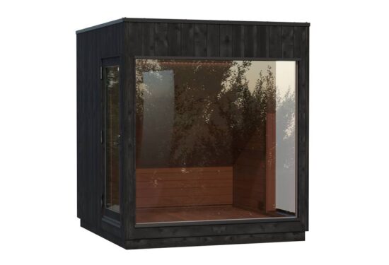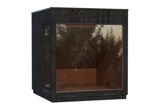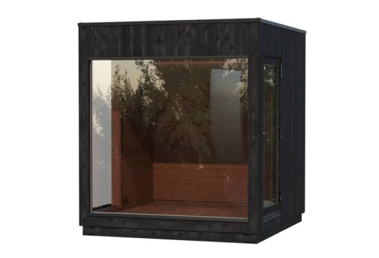 Eine rauchgraue, abschließbare Glastür mit einem schwarzen Holzrahmen schafft eine gemütliche Atmosphäre und ein Gefühl von Weite in der Lounge. Die hochwertige Thermoglastür ist solide gebaut und bleibt gut geschlossen. Die Anzahl der Türen der Lounge M hängt von der Wahl des Kunden ab und davon, ob die Lounge M neben der Sauna platziert oder als separates Modul aufgestellt wird.