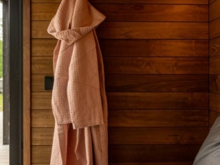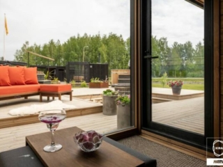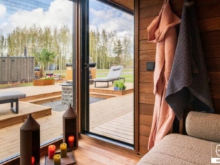 Alle Türen der Module haben das gleiche Design und die gleiche Größe. Die Tür der Sauna hat einen Türgriff aus Holz, einen Rollverschluss und ein Außenschloss, das einen Riegel, ein Vorhängeschloss und 2 Schlüssel umfasst. Die Tür der Lounge verfügt über einen schwarzen Abloy-Griff und ein Schloss mit Schlüsselverriegelung.