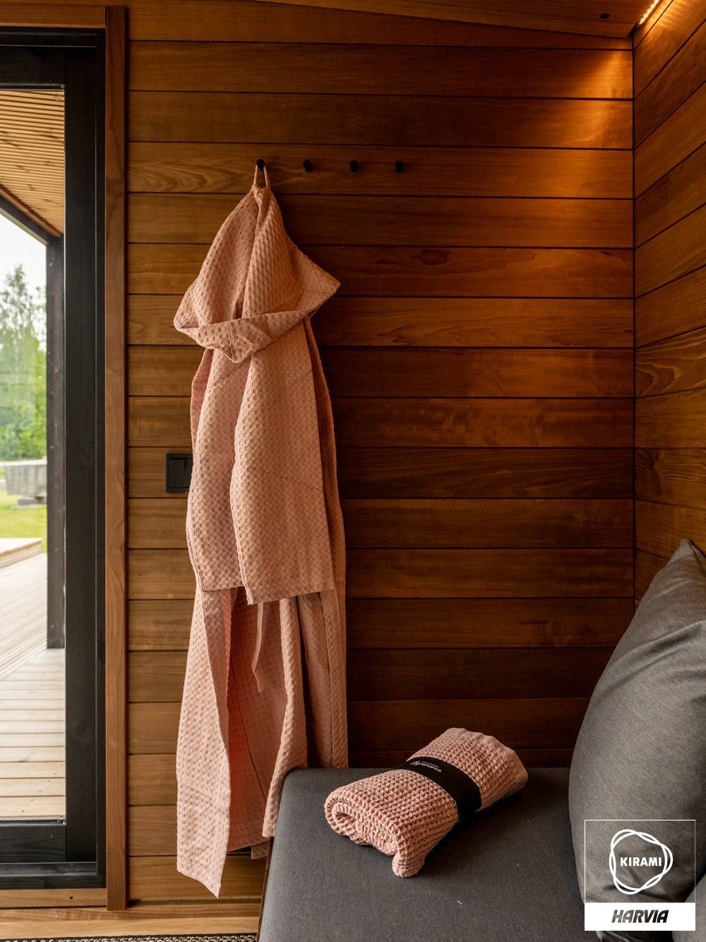 Wenn Sauna/* und Lounge gleichzeitig bestellt werden, ist es möglich, die Öffnungsrichtung der Saunatür spiegelverkehrt zu ändern. Bei der rechtsseitigen Sauna ist die Tür normalerweise rechts öffnend. Wird die Sauna/* mit einer Lounge verbunden, dann wird die Öffnungsrichtung der Tür auf links öffnend geändert.