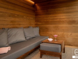 Die Oberflächenmaterialien der Lounge XL sind die gleichen wie bei den anderen Misty-Modulen: Die Außenverkleidung der Lounge besteht aus geradlinigen, wärmebehandelten (* Fichte) Nadelholzpaneelen. Die Wärmebehandlung verbessert die Widerstandsfähigkeit des Holzes gegen Fäulnis und reduziert die Feuchtigkeitsaufnahme. Die elegante, tiefschwarze Oberfläche des wärmebehandelten Holzes ist langlebig und die Farbe schützt das Holz vor Schmutz und UV-Strahlung. Diese pflegeleichte Außenverkleidung vervollständigt das moderne und stilvolle Erscheinungsbild der Lounge. Die Innenflächen der Lounge sind aus wärmebehandeltem Laubholz (* Espe) gefertigt. Der Boden, die Wände und die Decke der Lounge sind isoliert, so dass der Raum das ganze Jahr über angenehm zu nutzen ist.