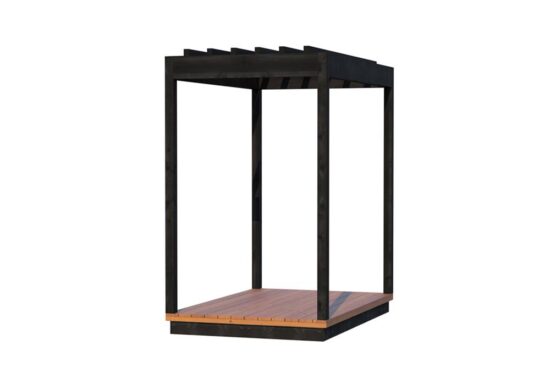 Die Pergola besteht aus der vormontierten Bodenplatte, auf der die Pfosten, der obere Ringbalken und die Dachbinder gemäß Anleitung zu montieren sind. Der Boden der Pergola besteht aus wärmebehandelter Kiefer, welche dem Bauwerk ein einheitliches und leichtes Erscheinungsbild verleiht. Die sonstigen Materialien der Außenfläche sind aus schwarz gefärbter Fichte gefertigt. Mithilfe der an den Pfosten der Pergola befindlichen Schraubverbindungen kann die Pergola leicht auf verschiedene Weise mit anderen Modulen der Misty – Reihe verbunden werden.