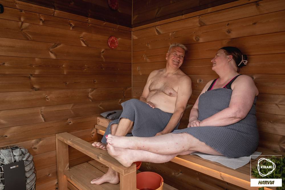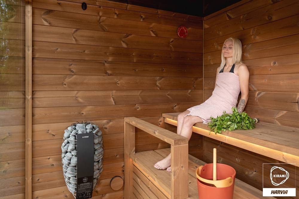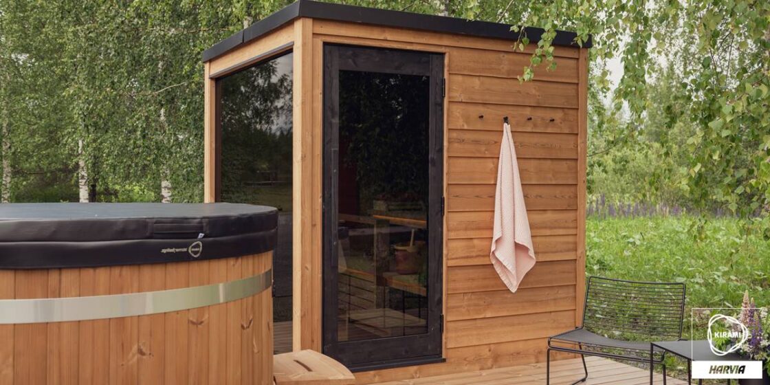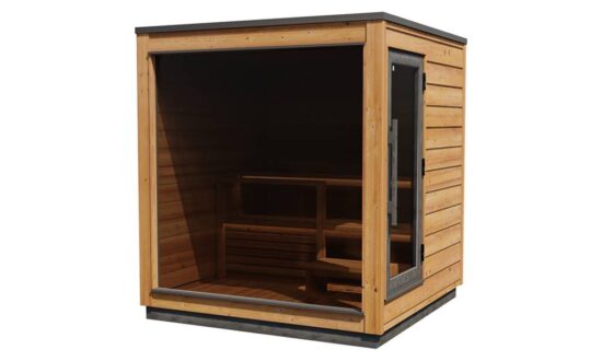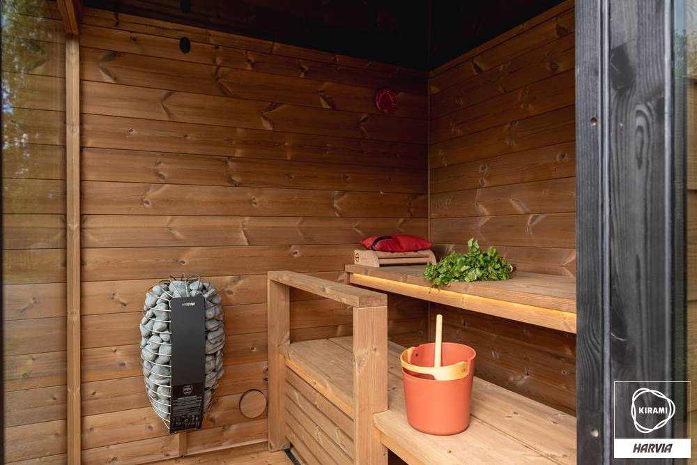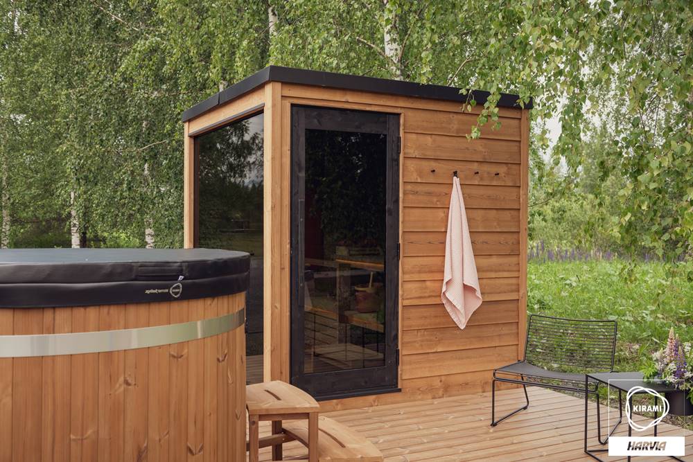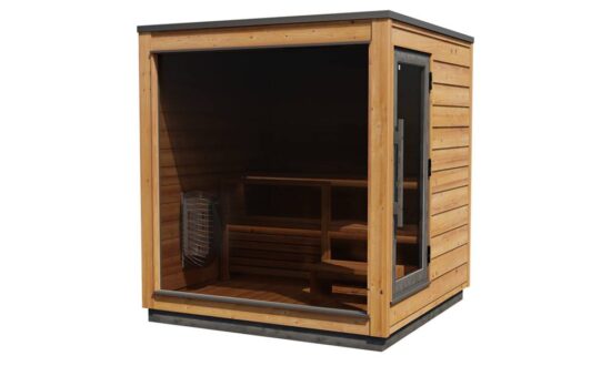 Die vormontierte Kirami FinVision® -Sauna M Dawn ist eine gebrauchsfertige Außensauna für 4-6 Personen.