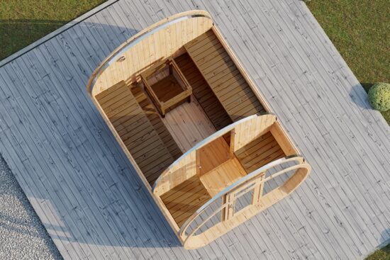 Raus aus dem Alltag, rein ins Saunafass. Hier zählt nur Entspannung. Schwitzen, atmen, loslassen. Zwei gemütliche Liegeflächen aus Thermoholz, eine Umkleide, wohltuende Aufgüsse und pure Erholung. Durch die verspiegelte Vollglasfront der Vorderseite und die Glastür, die in den Saunaraum führt, genießen Sie traumhafte Ausblicke. Ohne weitere Einblicke von außen finden Sie während der Saunagänge ausreichend Privatsphäre. Und die Welt? Die bleibt draußen!