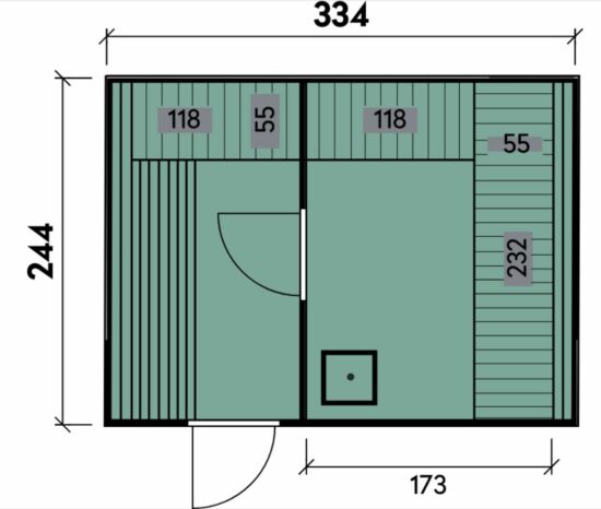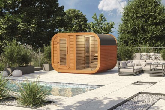 Mit Stella 3324 erleben Sie einmalige Saunagänge mit freiem Ausblick. Durch die Vollglastür schlendern Sie in den Vorraum. Wo Sie sich umziehen und die Pausen genießen. Im Saunaraum schwitzen Sie den Alltag aus den Gliedern. Tummeln sich gemütlich auf den Saunabänken mit Rückenlehne. Und beobachten Garten durch die außergewöhnliche Fensterfront der Vorderseite. Die Blockbohlen kommen gedämmt und naturbelassen. Mit Anstrichen in den Farben Kiefer (transparent), Hellgrau und Anthrazit (beide deckend) erhältlich.