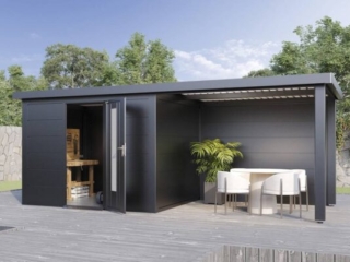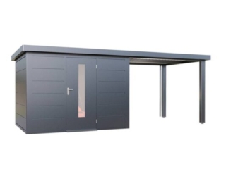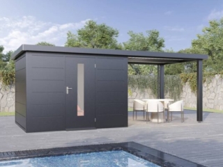 Ihr Premium-Gerätehaus mit Seitendach– Perfektion in Design und Funktion Dieses Metall-Gartenhaus mit Seitendach wurde für anspruchsvolle Menschen entwickelt, die Wert auf Design, Qualität und Funktionalität legen. Gefertigt aus korrosionsbeständigem, feuerverzinktem Stahlblech und veredelt mit einer widerstandsfähigen Pulverbeschichtung, bietet es nicht nur eine zeitlose Optik, sondern auch außergewöhnliche Langlebigkeit und Flexibilität. Herausragende Vorteile: Superschnelle Montage: In weniger als 4 Stunden ist Ihr Metall-Gartenhaus mit Seitendach einsatzbereit – ideal für einen schnellen und unkomplizierten Start. Wartungsfrei mit 25 Jahren Garantie: Einmal aufgebaut, genießen Sie jahrzehntelange Beständigkeit mit geringem Pflegeaufwand. Robust und belastbar: Mit einer Dachlast von 150 kg/m² und Windbeständigkeit bis Stärke 12 hält es auch extremen Bedingungen stand. Sicherer Stand: Der umlaufende Bodenrahmen mit Fundament-Befestigung garantiert maximale Stabilität. Ästhetik und Komfort: Große, verzugsfreie Türen mit Lichtelementen sorgen für einen großzügigen Zugang. Gasdruckfedern ermöglichen ein sanftes Öffnen und Schließen. Stilvolle Edelstahl-Türdrücker mit Zylinderschloss bieten Sicherheit und Eleganz. Ergänzt durch einen optionalen hellgrauen, rutschfesten Stahlboden mit 30 mm XPS-Hartschaumplatten erfüllt das Metall-Gerätehaus auch höchste funktionale Ansprüche und bietet zudem eine solide Dämmung. Das Seitendach schafft zusätzlichen Raum und schützt vor Regen und Sonne – ideal für extra Abstellflächen oder eine chillige Lounge zum Entspannen und Feiern. Die optionalen Seitenwände, mit oder ohne Fenster, machen das Metall-Gartenhaus zum flexiblen Allrounder für den Garten. Durchdachte Details: Das integrierte Dachentwässerungssystem mit drei Fallrohren leitet Regenwasser zuverlässig ab. Ein Anti-Tropf-Vlies verhindert die Bildung von Kondenswasser unter dem Dach. Auch unter dem Seitendach. Details Seitendach: Das Seitendach ist mit höhenverstellbaren Pfosten ausgestattet und bietet dadurch maximale Flexibilität. Ein Blickfang für Ihren Garten: Mit seiner modernen, zeitlosen Optik wird dieses Metall-Gartenhaus mit Seitendach zum visuellen Mittelpunkt in Ihrem Garten. Es verbindet außergewöhnliche Ästhetik mit Funktionalität, setzt einen klaren Akzent für stilvolles Design und Qualität und bietet dabei höchste Flexibilität in der Nutzung. Individuell anpassbar: Wählen Sie aus umfangreichem Zubehör wie Seitenwänden, Glasschiebetüren, Sonnenrollos oder Beleuchtungssystemen. Unser optionaler Montageservice sorgt für einen stressfreien Aufbau – für noch mehr Komfort. Gestalten Sie Ihren ganz persönlichen Rückzugsort.